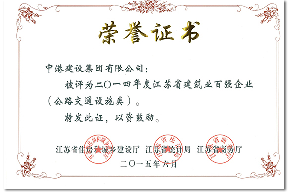 2015年6月11日,由江蘇省住房和城鄉(xiāng)建設(shè)廳、江蘇省統(tǒng)計(jì)局、江蘇省商務(wù)廳共同舉辦的全省建筑業(yè)創(chuàng)新發(fā)展暨2014年度百?gòu)?qiáng)企業(yè)發(fā)布會(huì)在南京隆重召開,會(huì)上,中港建設(shè)集團(tuán)有限公司被評(píng)為“二0一四年度江蘇省建筑業(yè)百?gòu)?qiáng)企業(yè)”,這是江蘇省公路交通設(shè)施類唯一一家獲此殊榮的企業(yè),集團(tuán)公司總裁秦高舉參加了大會(huì)并領(lǐng)取證書和獎(jiǎng)牌。